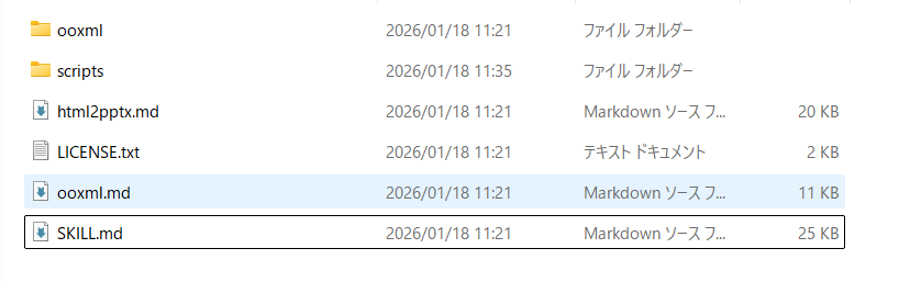 Agent Skills の実体は SKILL.mdというファイルで定義されLLMに指示を出しています。例えば前回の記事で作成した pptx skillのSKILL.mdは以下の様になっています。